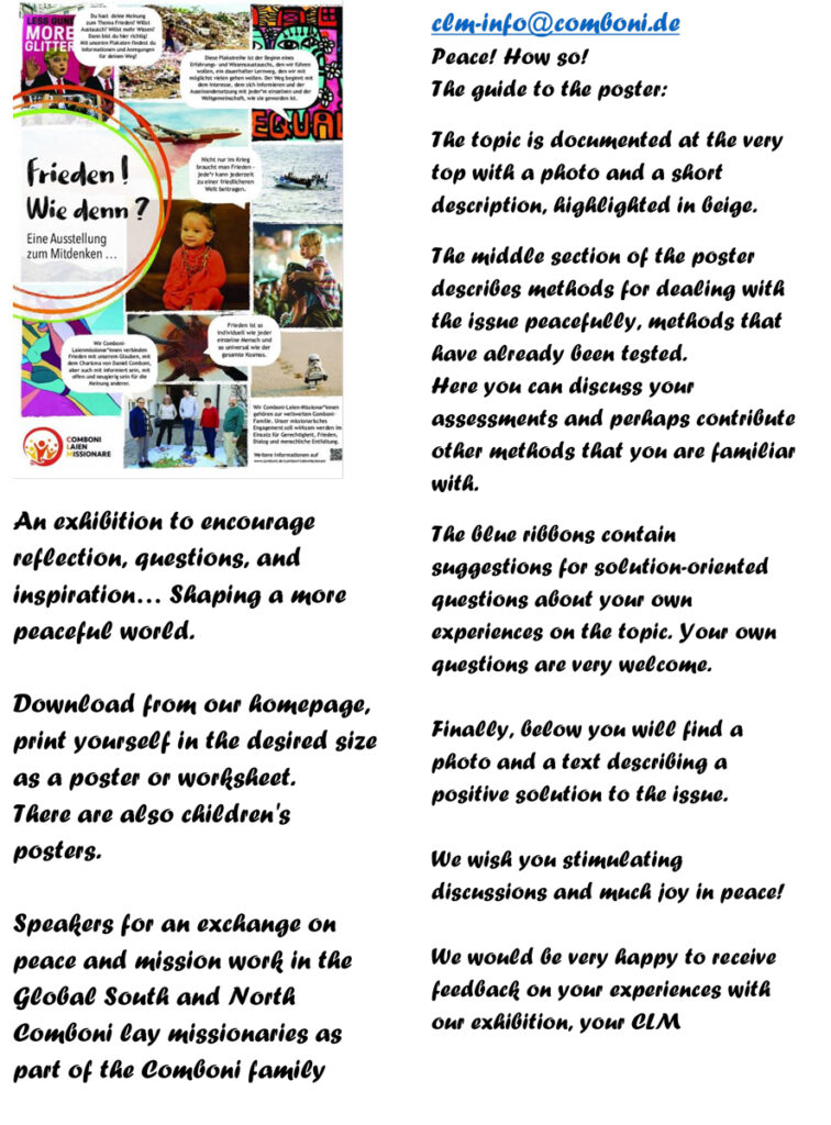 One of the activities they carry out in Germany is the promotion of peace. These posters are offered free of charge to teachers, educators, and Christian communities.