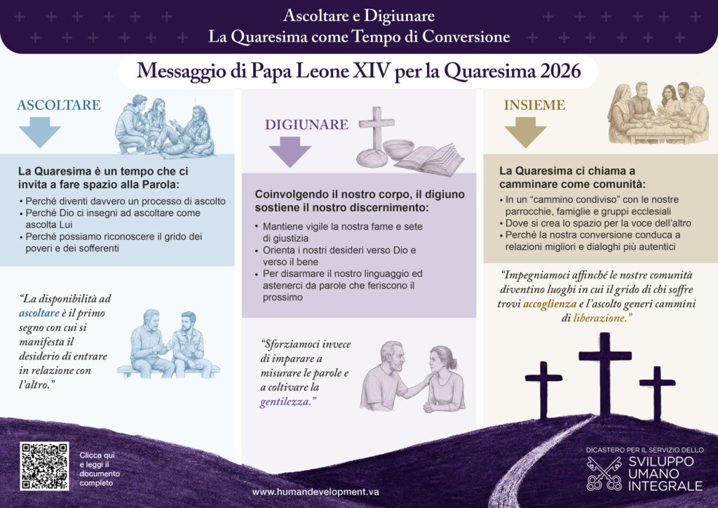 Allo stesso modo, le nostre parrocchie, le famiglie, i gruppi ecclesiali e le comunità religiose sono chiamati a compiere in Quaresima un cammino condiviso, nel quale l’ascolto della Parola di Dio, come pure del grido dei poveri e della terra, diventi forma della vita comune e il digiuno sostenga un pentimento reale. In questo orizzonte, la conversione riguarda, oltre alla coscienza del singolo, anche lo stile delle relazioni, la qualità del dialogo, la capacità di lasciarsi interrogare dalla realtà e di riconoscere ciò che orienta davvero il desiderio, sia nelle nostre comunità ecclesiali, sia nell’umanità assetata di giustizia e riconciliazione.