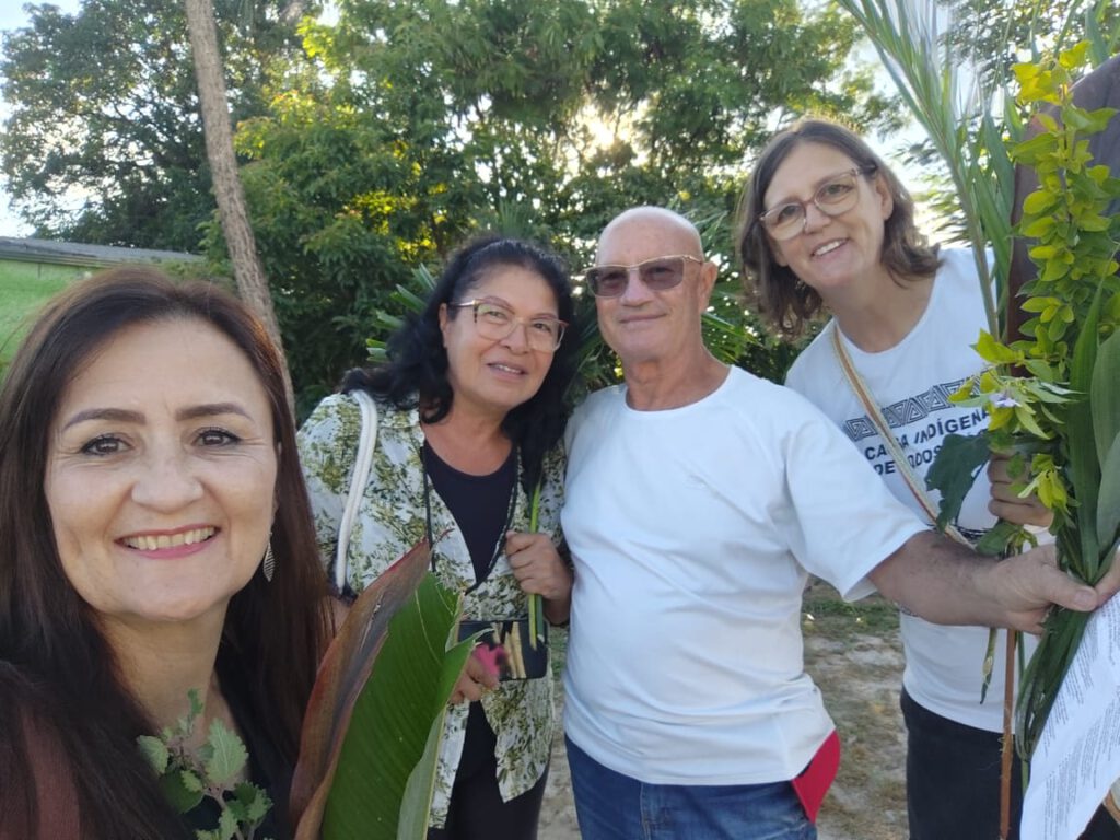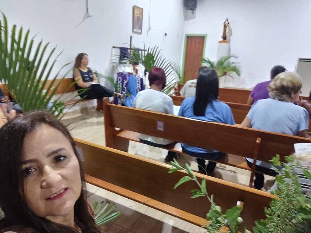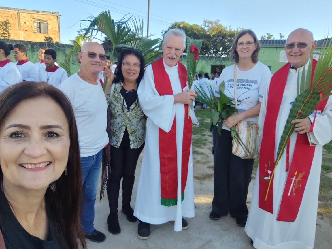 Al día siguiente, iniciamos nuestra etapa de formación presencial con la procesión de Ramos que salió de la comunidad de Nuestra Señora Aparecida, en Ipê Amarelo, hasta la comunidad de San Judas (unos 2,5 km), donde se celebró la misa que reunió a las 10 comunidades de la parroquia de Santo Domingo de Gusmão.